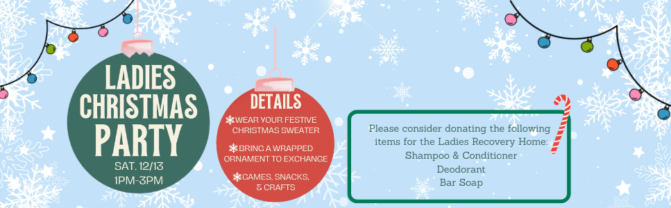 Wear your Christmas Sweater, bring a wrapped ornament and join us on Saturday, December 13th from 1-3 pm for games, crafts, fun and fellowship.